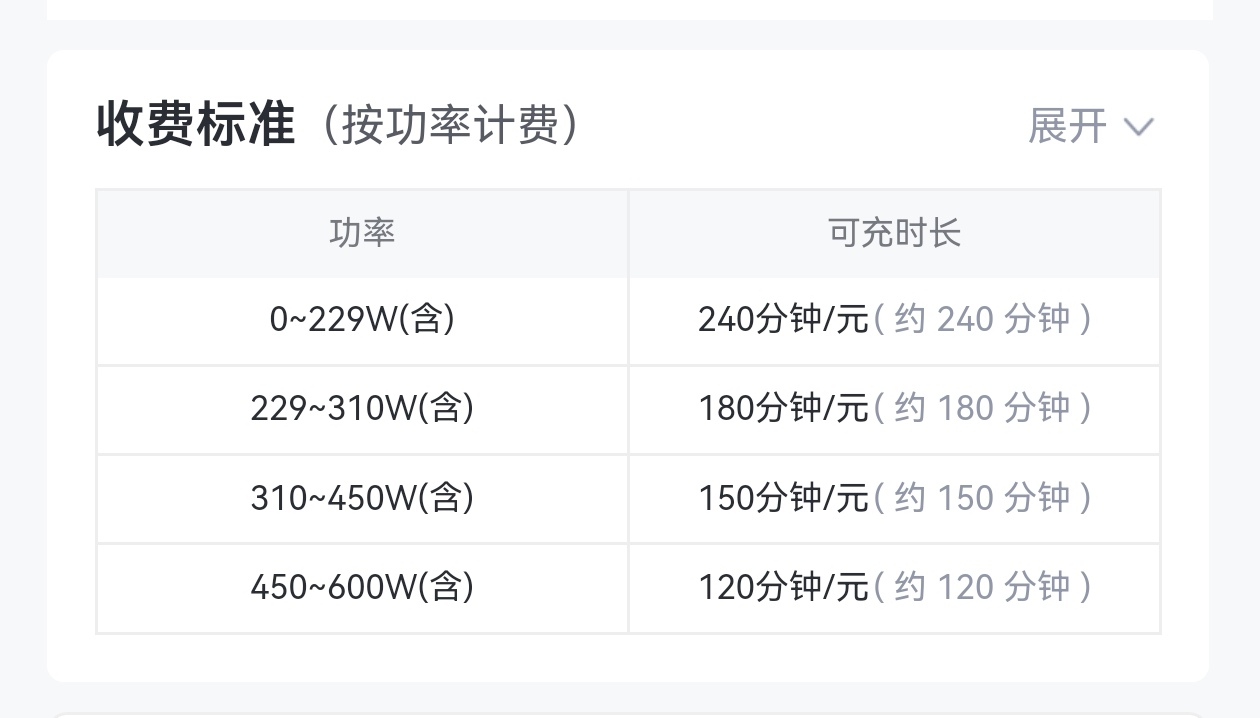 在车站西街15号院,记者也在车棚里看到一排按功率计费的充电桩。收费标准显示,0W至229W(含),1元可充240分钟;229W至310W(含),1元可充180分钟;310W至450W(含),1元可充150分钟;450W至600W(含),1元可充120分钟。