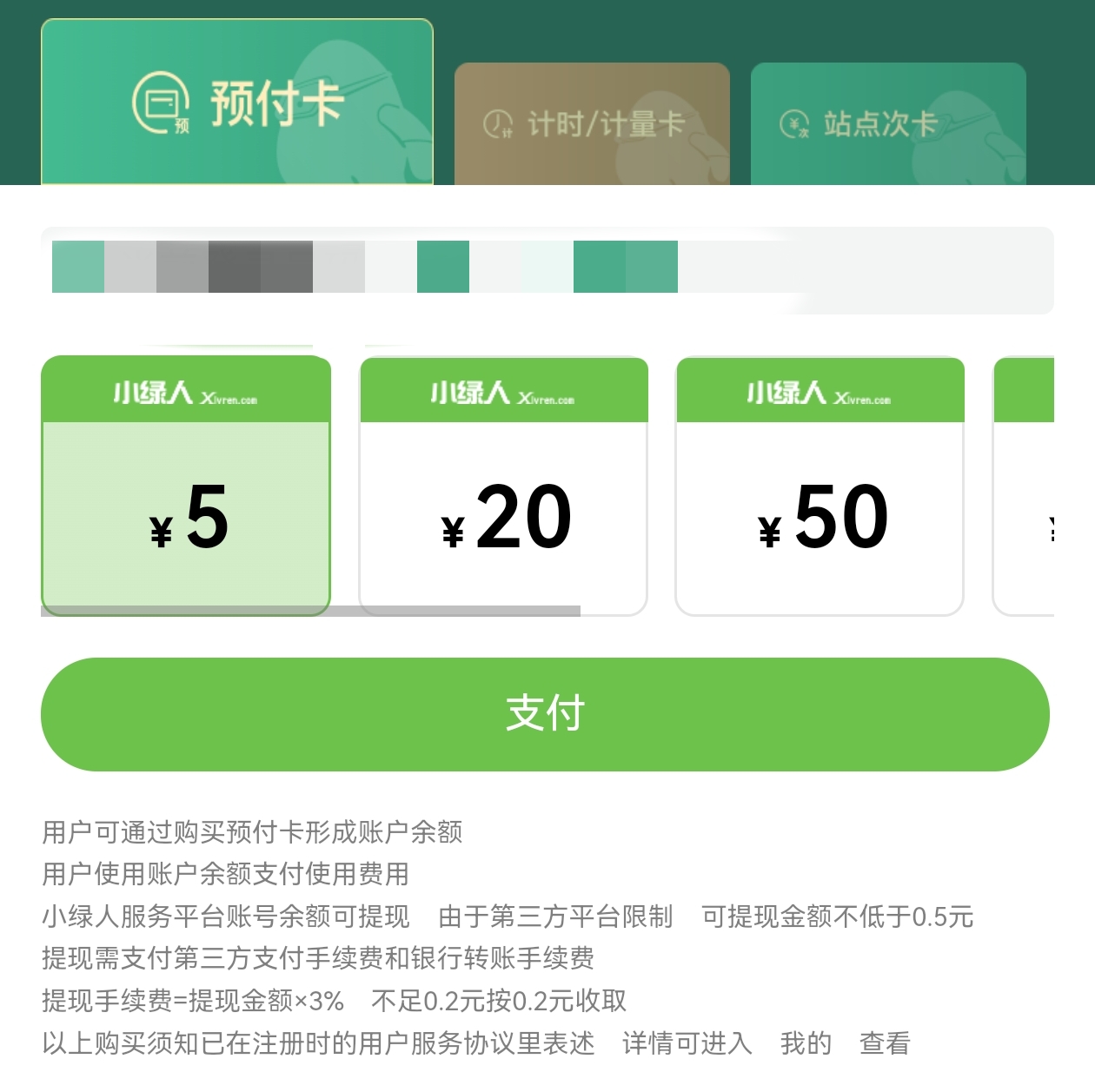 在西豪逸景小区,车棚内可以看到不同运营商安装的电动自行车充电桩,公示的收费标准基本均为电费0.5103元/度,服务费0.51元/度。记者尝试扫描“小绿人”充电桩的二维码,发现需要购买5元到200元不等的预付卡,形成账户余额,支付使用费用,或者花费189元开通月卡。